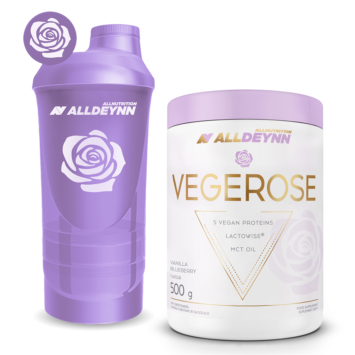 ALLDEYNN VEGEROSE to wysokobiałkowa odżywka do picia, oparta na premiksie pięciu białek roślinnych; izolacie białka grochu, koncentracie białka ryżowego, żurawinowego, migdałowego oraz białka konopnego. Wzbogacona została o brandowy kompleks probiotyczno-prebiotyczny LactoWise®, błonnik z akacji, siemię lniane oraz olej MCT.