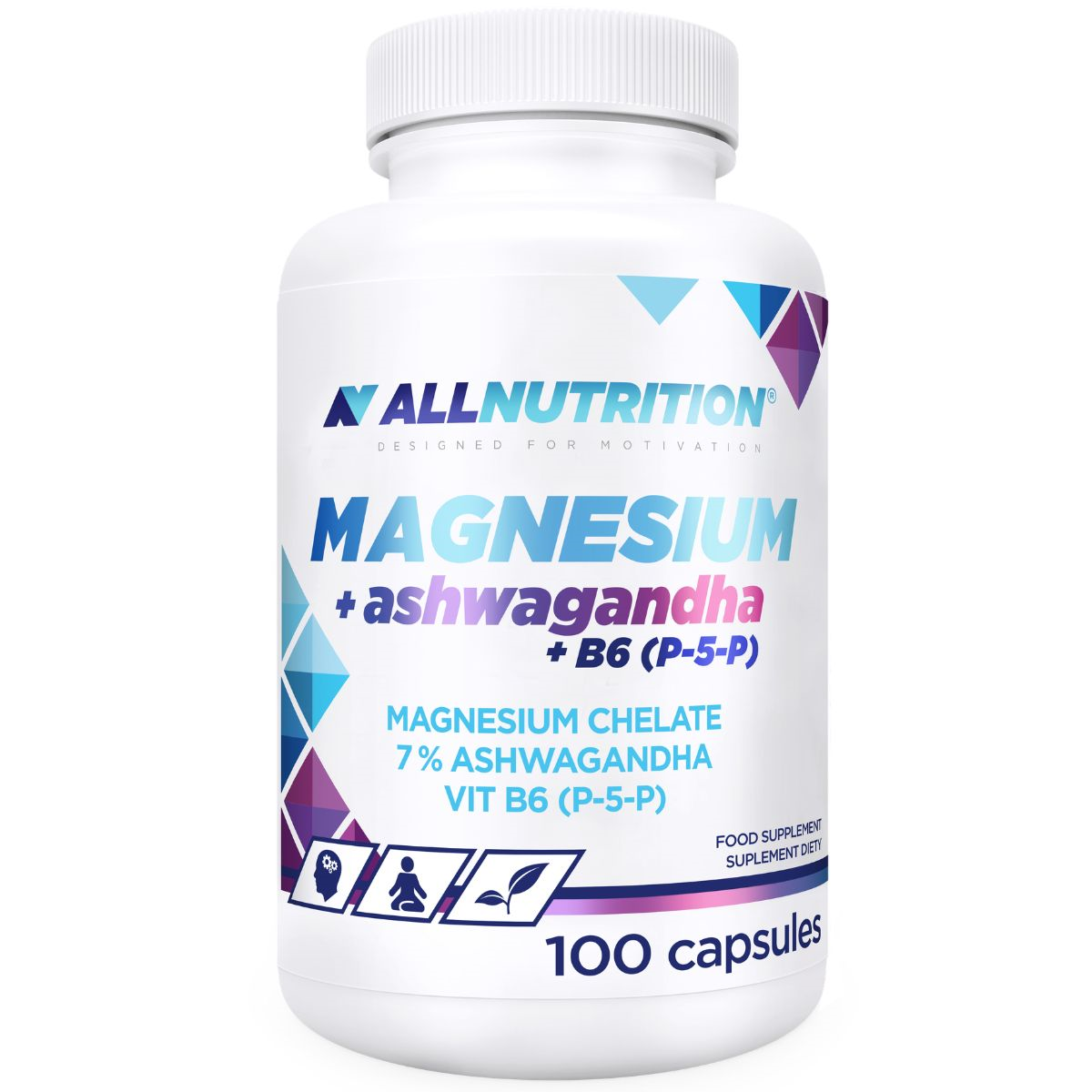 ALLNUTRITION MAGNESIUM + ASHWAGANDHA + B6(P-5-P) to suplement diety w formie kapsułek, zawierający trzy starannie dobrane składniki aktywne: magnez, witaminę B6 w aktywnej formie P-5-P oraz ekstrakt z korzenia ashwagandhy. Produkt stworzony dla aktywnych, które chcą uzupełnić codzienną dietę o te składniki w jednej, wygodnej kapsułce.