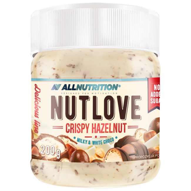 NUTLOVE Crispy Hazelnut to przepyszny krem orzechowy z dodatkiem płatków białej czekolady. To już kolejna odsłona przepysznego kremu marki ALLNUTRITION. Z pewnością przypadnie Ci do gustu. Już pierwszy kęs przeniesie Cię myślami do tych słodkich chwil, które tak dobrze pamiętasz. Pozwól się rozpieścić.