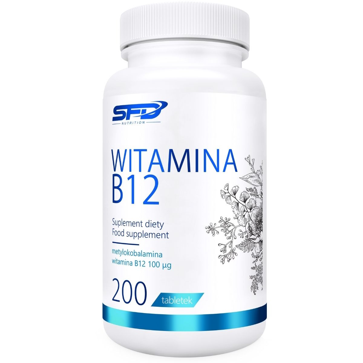 SFD WITAMINA B12 to suplement uzupełniający dietę w witaminę B12, która m.in. pomaga w prawidłowym funkcjonowaniu układu nerwowego, prawidłowej produkcji czerwonych krwinek oraz odgrywa rolę w podziale komórek.